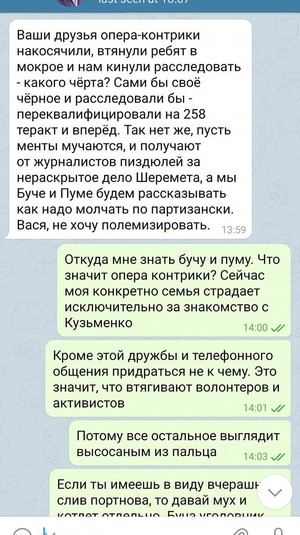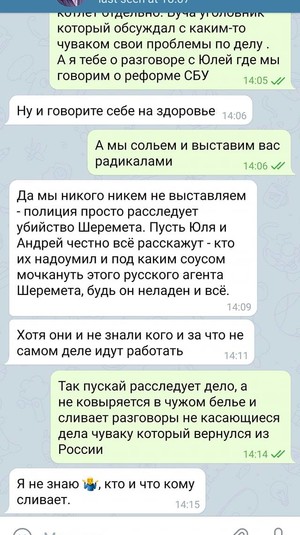 «Нехай Юля та Андрій чесно розкажуть, хто їм сказав мочканути цього російського агента Шеремета, будь він неладний», — йдеться у листуванні.