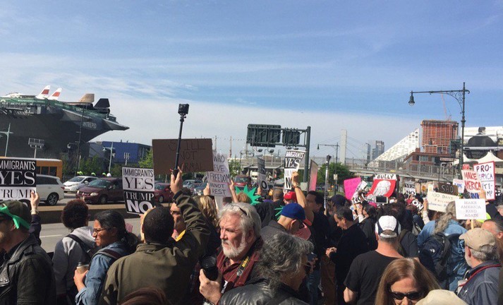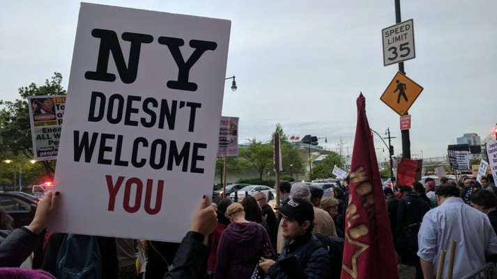 Дональд Трамп вперше завітав у Нью-Йорк після вступу на посаду президента США. Жителі міста зустріли його масовими протестами, які вони проводили біля вежі Трампа та Капітолію. Протестувальники стояли з плакатами «Ні Трампу», «Захисти американців - збережи Obamacare».