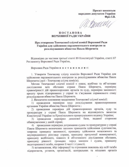 Народна депутатка з парламентської фракції «Європейська солідарність» Ірина Фріз зареєструвала постанову про утворення Тимчасової слідчої комісії для розслідуванням вбивства Павла Шеремета.