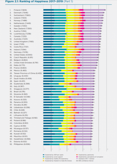 Доповідь World Happiness Report була вперше випущена у 2012 році за підтримки ООН. У ній оцінюються 156 країн і враховуються наступні показники: ВВП на душу населення, соціальна підтримка, очікувана тривалість життя, сприйняття корупції та інші.