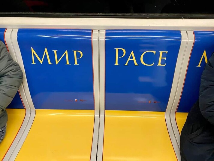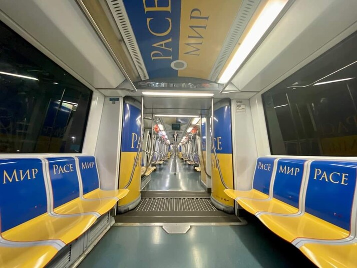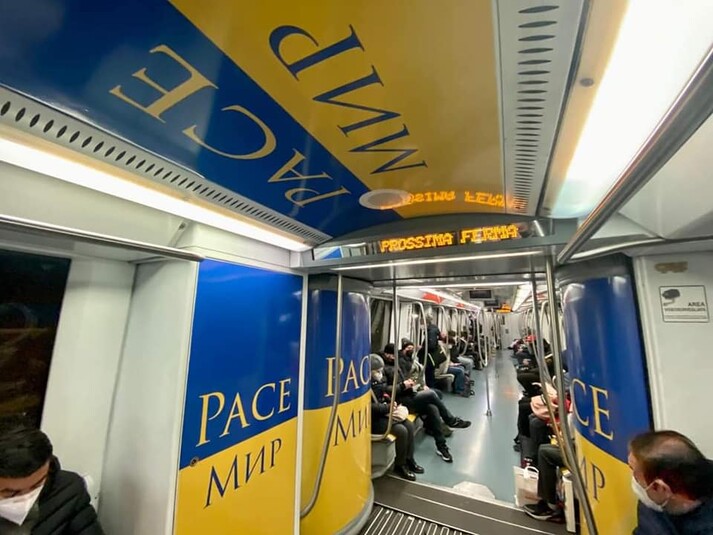 В римському метро один з потягів прикрасили жовто-блакитною символікою з написами «Мир».