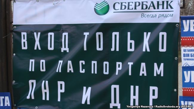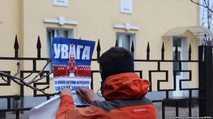 Біля двох входів до установи представники «Національного корпусу» розмістили бетонні блоки з написами «Добро пожаловать в Россию», «Вход только по паспортам ЛНР и ДНР» та «Увага! Це банк країни-агресора. Він буде закритий. Терміново забирайте свої гроші».