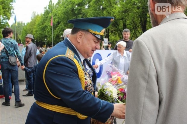 Чоловік приймав квіти та привітання від дітей і був у формі, яка була завішана медалями