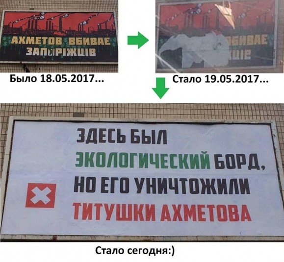 В декількох районах Запоріжжя з'явилися борди з написом «Ахметов вбиває запоріжців». На тлі написи автори плакатів показали труби промислових підприємств, дим яких зображений у вигляді людських черепів.