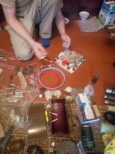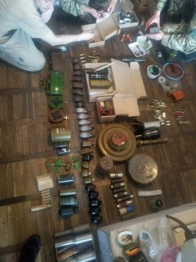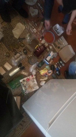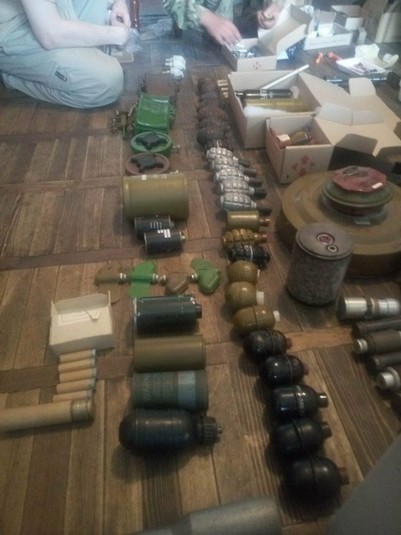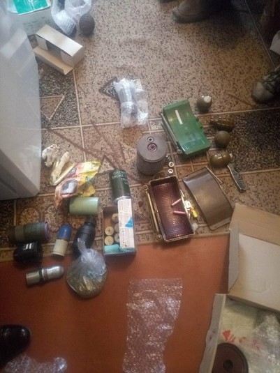 Під час обшуку в квартирі зловмисника правоохоронці вилучили предмети схожі на боєприпаси, зокрема три міни МОН-100 і МОН-50, п’ять протипіхотних мін інших типів та три мінних універсальних взривача, eлектродетонатор, постріли до підствольних гранатометів, чотири ручні гранати різних типів та запали до них, піротехнічні патрони, порошкоподібні та пресовані хімічні речовини в кустарній упаковці.