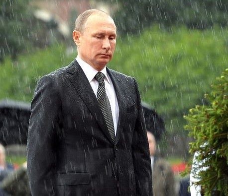 Захід супроводжував проливний дощ, проте під час покладання квітів Путін не скористався парасолькою і промок до нитки.