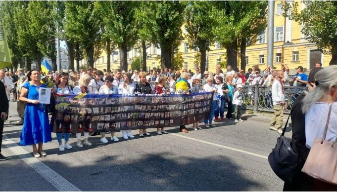 У перших шеренгах йдуть діти загиблих бійців. Вони тримають у руках фотографії своїх батьків.