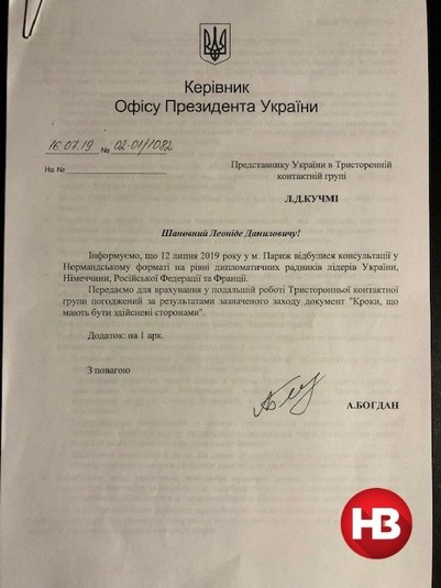 Україна погодилася розглянути так звану «формулу Штайнмаєра» ще в липні 2019 року під час консультацій на рівні дипломатичних радників лідерів нормандської четвірки. Про це свідчить лист керівника Офісу президента Андрія Богдана, адресований представнику України в Тристоронній контактній групі з врегулювання ситуації на Донбасі Леоніду Кучмі, який в п'ятницю, 18 жовтня, опублікувало НВ.