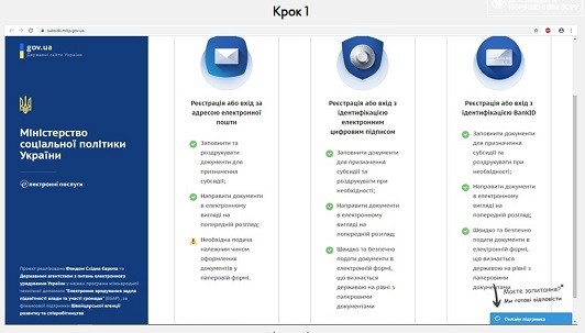 У разі обрання «реєстрація або увійти за адресою електронної пошти» зазначено, що необхідно подати документи в паперовій формі (після заповнення форми на сайті вам прийде ПДФ-версія цього видання, яку потрібно буде роздрукувати, підписати і занести в орган соціального захисту).
