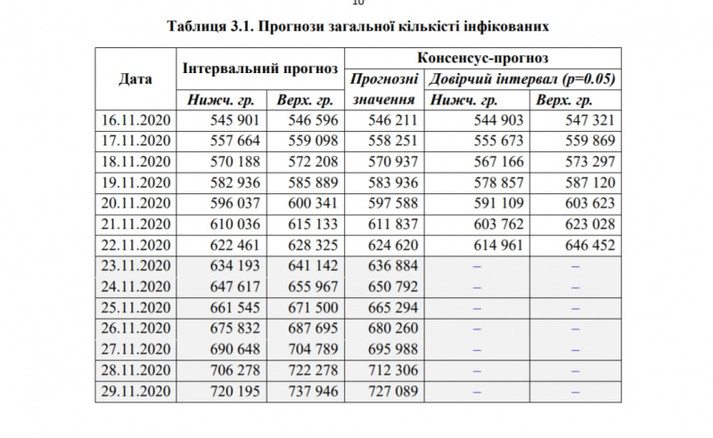 Згідно з прогнозом науковців, до 29 листопада загальна кількість випадків коронавірусу може досягти 737 946, що на 192 257 випадків більше, ніж сьогоднішнє число випадків. Станом на 16 листопада, за даними МОЗ, зареєстровано 545 689 хворих.