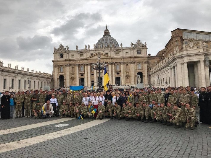 Сьогодні військовослужбовці Збройних Сил України, Національної гвардії України, Державної прикордонної служби України, поранені воїни АТО, жінки, які втратили чоловіків на війні, курсанти та оркестр Національної академії сухопутних військ імені Сагайдачного взяли участь в загальній аудієнції Папи Римського Франциска на площі Святого Петра у Ватикані, передає посольство України у Ватикані.