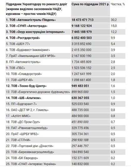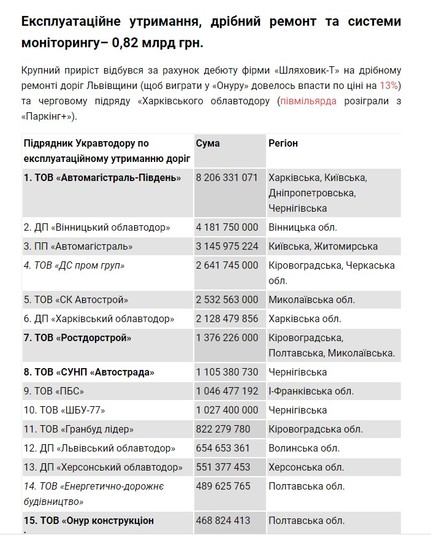 Нещодавно «Схеми» розповідали, що «Автомагістраль-Південь» із початку 2020 року виграла тендерів на будівництво доріг по всій Україні сумарно на близько 37 мільярдів гривень, ще вісім мільярдів гривень – на експлуатаційне утримання доріг. Ця компанія – лідер серед усіх приватних підрядників державної програми «Велике будівництво», отримує близько третини усього фінансування, порахували журналісти видання «Наші гроші».