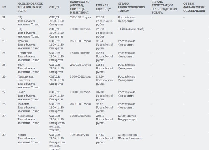 Серед замовлених товарів – 10 тисяч пачок сигарет Parliament, 2 тисячі пачок «Собрание», 3 тисячі пачок «Лиггетт-Дукат» і 705 пачок сигарет «Ангара».