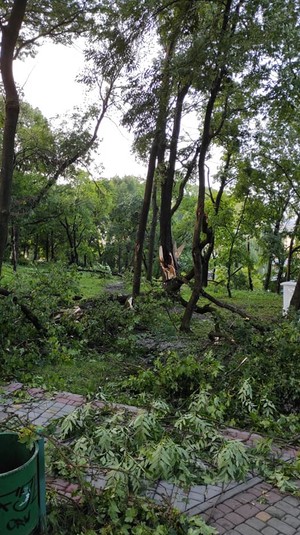 Він показав фото, де видно, що буревій поламав дерева в парку та наробив великої шкоди. Також відомо, що після стихії місцеві жителі сидять без світла.