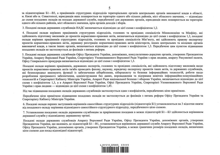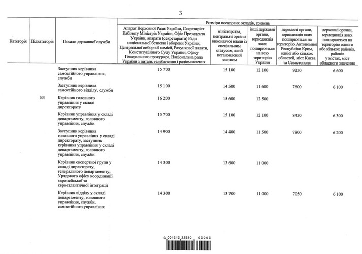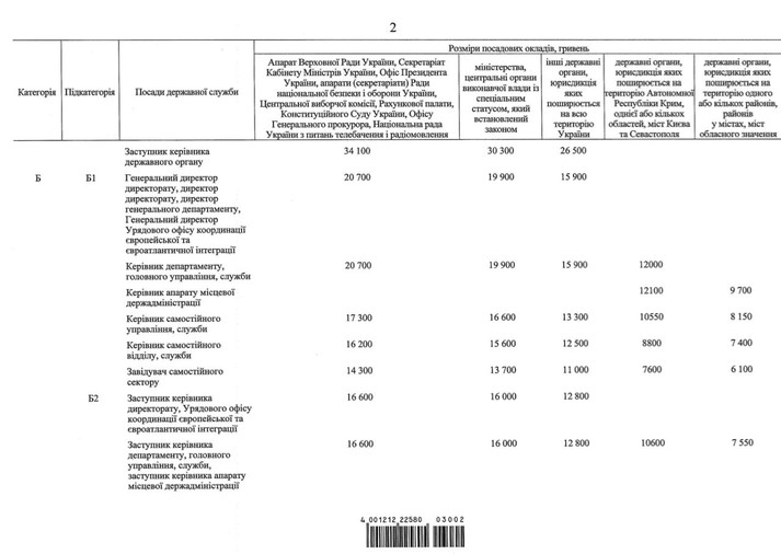 Оклад керівників апарату Верховної ради, Секретаріату Кабінету міністрів, Офісу президента, апарату Ради національної безпеки і оборони України, Центральної виборчої комісії, Рахункової палати, Конституційного суду, Офісу генерального прокурора, Національної рада України з питань телебачення і радіомовлення встановлені на рівні 37800 гривень.