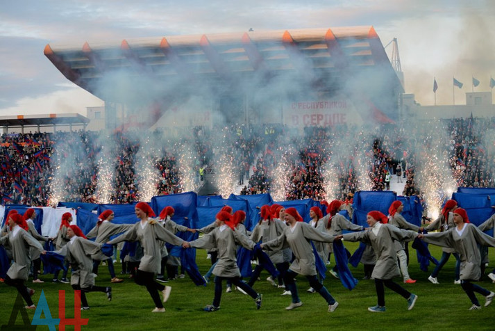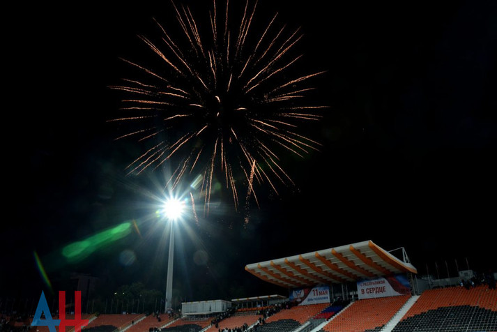 Кульмінацією святкування у Донецьку стало вогняне шоу. «Більше 50 залпів різного розміру і форми створили яскраву і різнобарвну картину над стадіоном республіканського спортивного комплексу «Олімпійський». Дійство тривало близько 10 хвилин і викликало бурхливі емоції глядачів», - пише сепаратистський сайт ДАН.