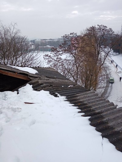 У місті Бурштин Івано-Франківської області через сніг зруйнувалася частина покрівлі багатоповерхового житлового будинку на вулиці Коновальця, 5. Про це йдеться на сторінці Бурштинської міської ради у Facebook.