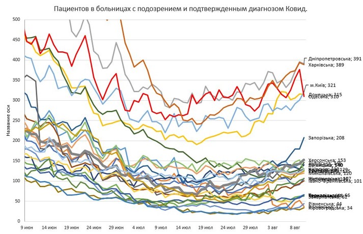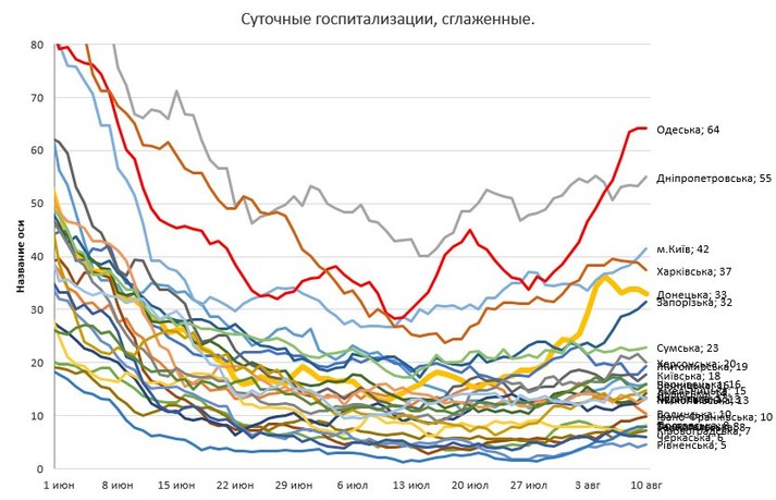 «До ряду областей, які давно лідирують за кількістю хворих на Covid-19, додалося ще дві, де за останній тиждень спостерігається значне збільшення (кількості госпіталізацій – авт.)», – пише автор публікації. Це Запорізький та Херсонський регіони, де саме пік туристичного сезону.