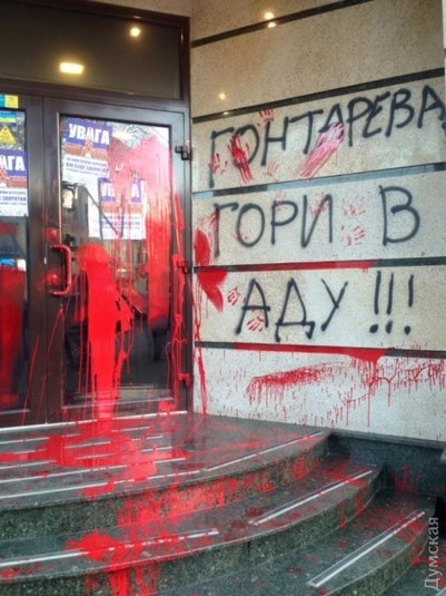 Як повідомляв «Главком», аналогічний перфоменс в Одесі влаштували наприкінці лютого: активісти громадянського корпусу «Азов» обмалювали фарбою будівлю «Промінвестбанку» на вулиці Пушкінській.