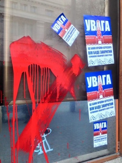 На стінах біля входу активісти розклеїли листівки з інформацією про те, що «це банк країни агресора, і скоро він буде закритий», тому вкладникам необхідно терміново забирати свої гроші.