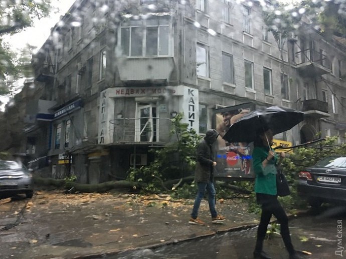 Видання Думская додає, що на перехресті Пушкінської та Великої Арнаутської дерево впало на припарковані автомобілі.