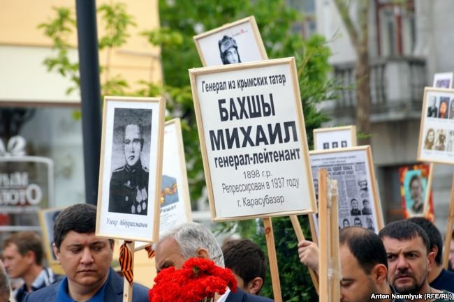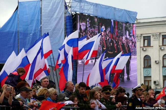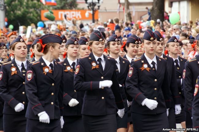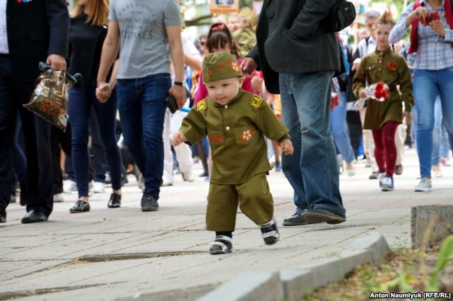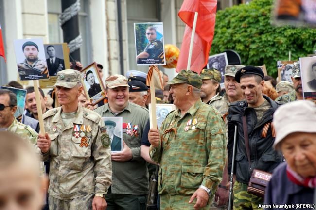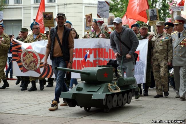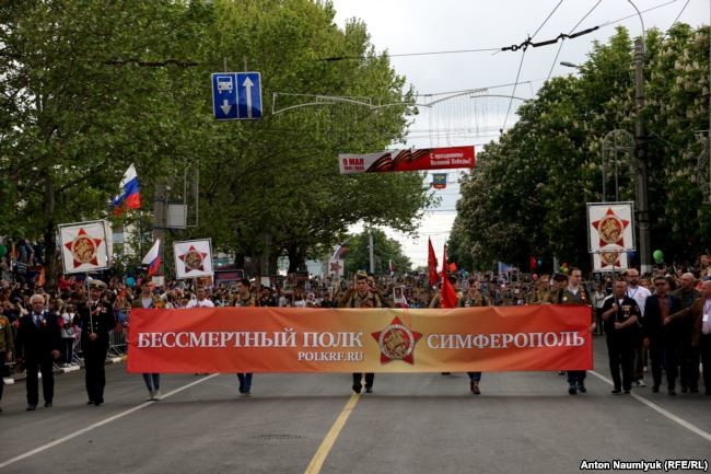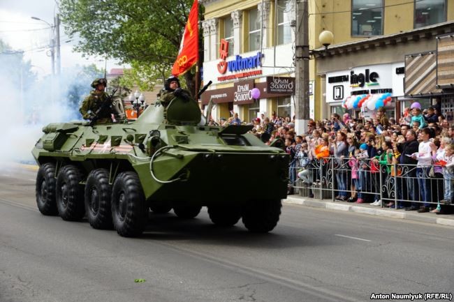 Парад до Дня перемоги в окупованому Росією Сімферополі цього року вперше проводився з військовою технікою. Проспектом Кірова проїхала колона з «Градами», БТР і балістичними ракетами. На броні сиділи озброєні солдати.