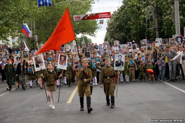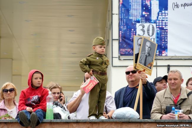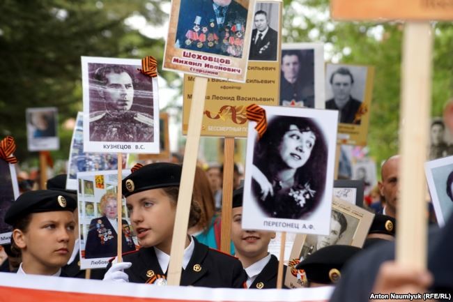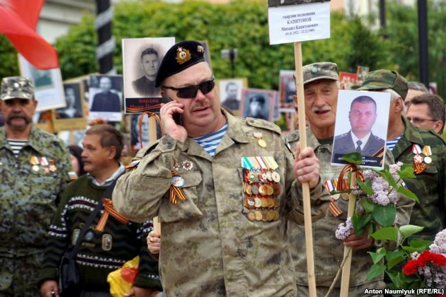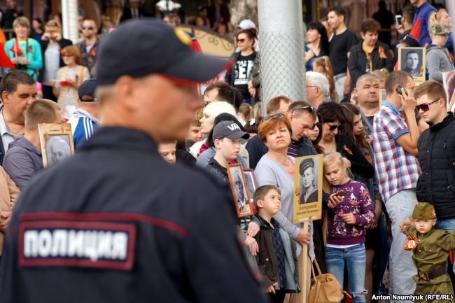 Парад закінчився швидко, оточення зняли, але огорожу не прибрали. Глядачі почали перелазити через неї, далеко вже шикувалися колони маршу «Безсмертний полк». Багато хто тримав у руках плакати з фотографіями, покарбованими «георгіївською стрічкою».