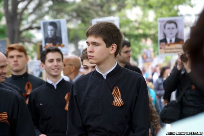 У багатьох людей значки з «георгіївською стрічкою». Їх продавали в Сімферополі всюди.