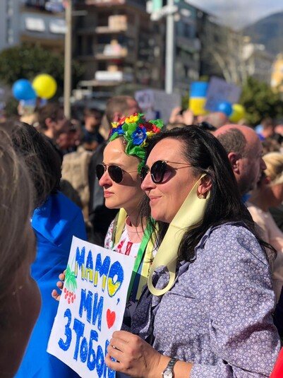 Як розповіла учасниця подій, Оксана Воронцова, на акцію вийшло близько пів тисячі людей. Підтримати Україну прийшли також білоруси, казахи, азербайджанці та громадяни інших країн.