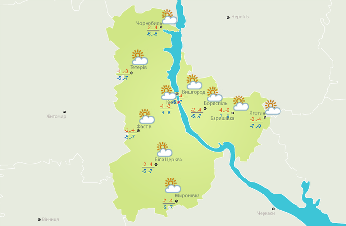 столиці сьогодні вдень від -1 до -3 градуси, вночі від -4 до -6. Вітер східний, 3-8 м/с. Вночі можливий невеликий сніг, вдень істотних опадів не очікується.