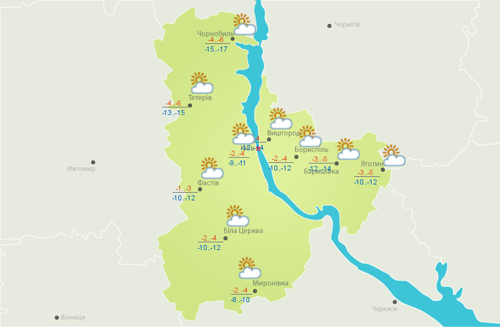 У Києві температура повітря становитиме від -2 до -4 вдень та від -9 до -11 вночі. Вітер південно-західний, 5-10 м/с. У столиці вночі сніг, вдень без істотних опадів.
