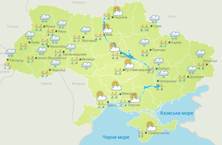 У північних регіонах без опадів, сніг очікується лише в Сумській області, вдень від -1 до -5.