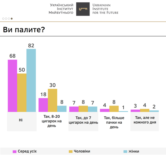 Щодо тютюнопаління, то більшість громадян (68%) стверджують, що не палять тютюн. Натомість кожен третій відповів, що в більшій чи меншій мірі палить. При цьому до пачки на день викурюють 18% опитаних.