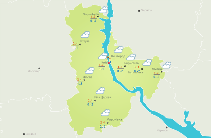 У столиці України 27 лютого без опадів, вдень від +1 до +3, вночі від -1 до +1, вітер північний 7-12 м/с.
