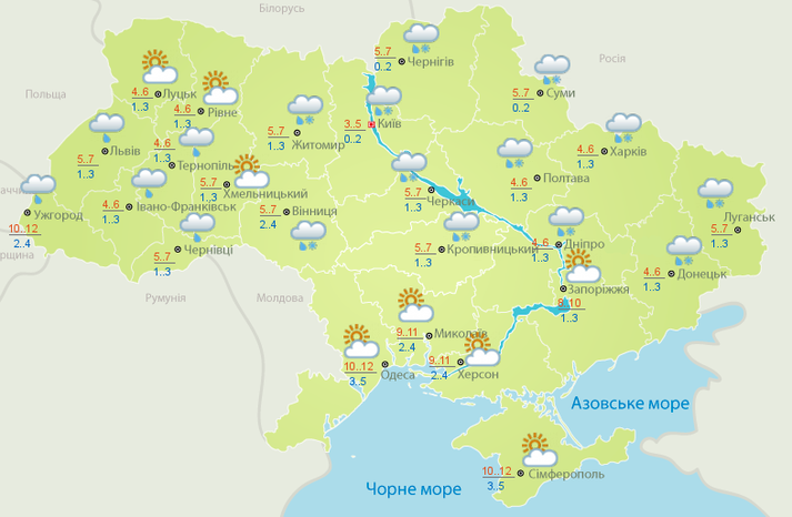 прогнозами українських синоптиків, у західних регіонах переважно дощі, без опадів тільки у Волинській, Рівненській та Хмельницькій областях, вдень від +4 до +12. На півночі дощі з мокрим снігом, вдень від +3 до +7.