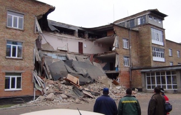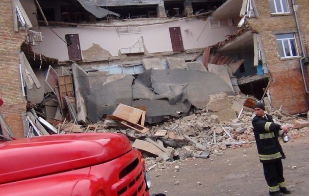 Як повідомили в ДСНС, обвалилась обвалилася фасадна стіна на трьох поверхах висотою 9 м і шириною 15 м, перекриття побутових приміщень та коридор.