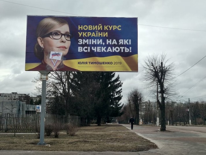У Житомирі невідомі обклеїли зображеннями з прапорами Росії 17 білбордів кандидатів у президенти.