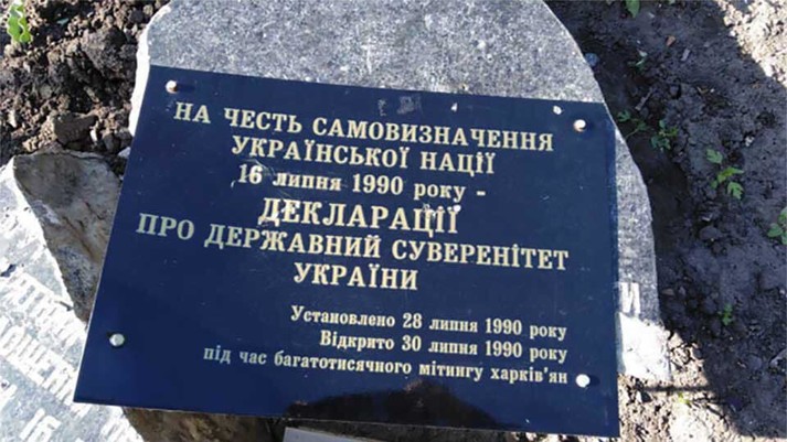 До кам'яної плити встановленої 30 липня під час багатотисячного мітингу жителів Харкова прикріплена табличка. На пам'ятному знаку вказано що він присвячений «Самовизначенню української нації 1990 року - Декларації про державний суверенітет».