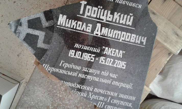«У ніч на 29 квітня невідомий войовничий ватник здійснив спробу розбити молотком меморіальну дошку, встановлену на честь полеглого азовця Миколи Троїцького (Акели), встановлену на фасаді Одеської ЗОШ #55, але злякавшись бабусю-сторожа, що вийшла на стук, провів тактичну втечу», - розповів активіст.