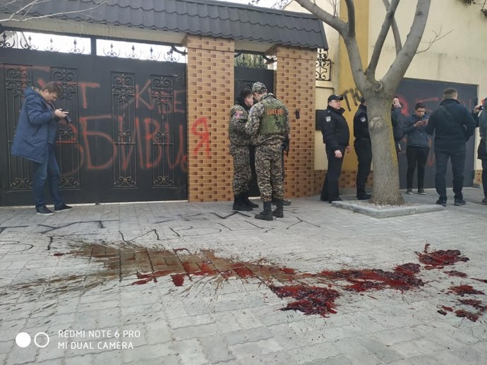 Також вони розмалювали ворота та асфальт біля будинку написами «Тут живе вбивця» і розлили кров тваринного походження.
