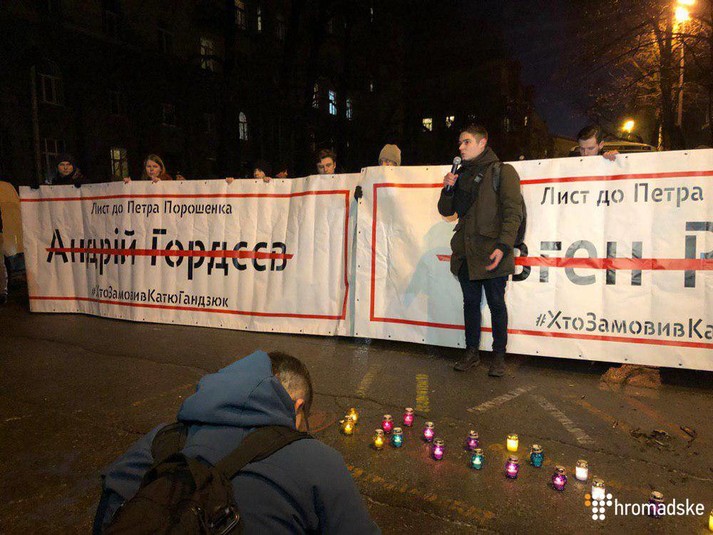 Учасники акції запалили лампадки та розгорнули плакати й банери з надписами «Вибачте, так а хто вбив Катю Гандзюк?»