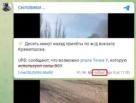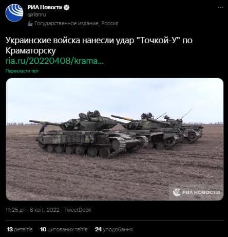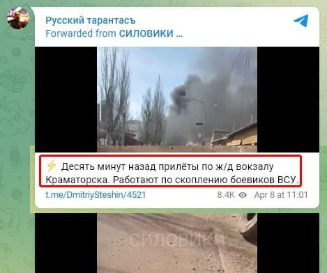 У п'ятницю, 8 квітня, одразу після обстрілу залізничного вокзалу крилатими ракетами «Іскандер» у російських пабліках у соцмережах та навіть у деяких офіційних ЗМІ з'явилася інформація про те, що росіяни вдарили по ЗСУ.