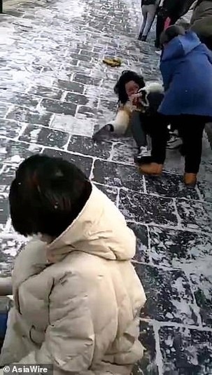 Вони тримаються за поручні, щоб піднятися на узвишшя і з'їжджають по крижаній бруківці вниз. Деякі навіть намагаються повзти вгору карачки.