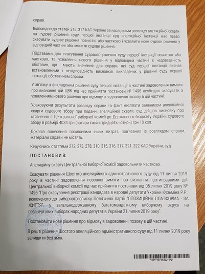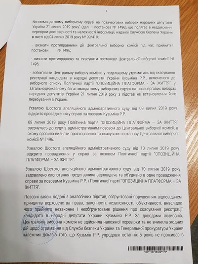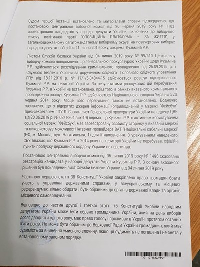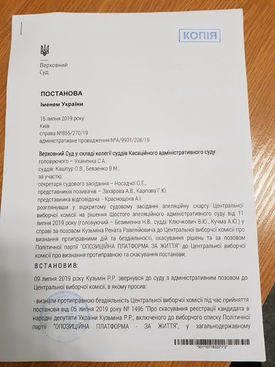 Судді Верховного суду підтвердили законність скасування Шостим апеляційним адміністративним судом зняття Кузьміна з реєстрації кандидатом за списками «Опозиційної платформи — За життя».