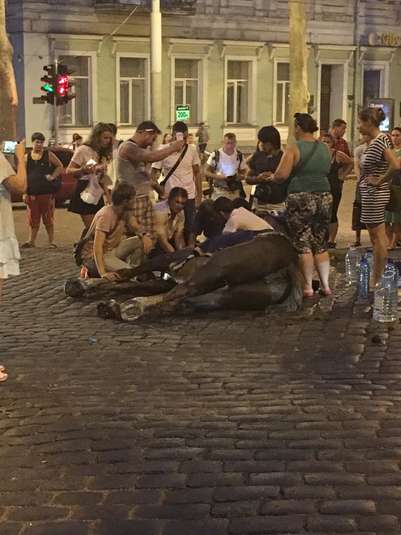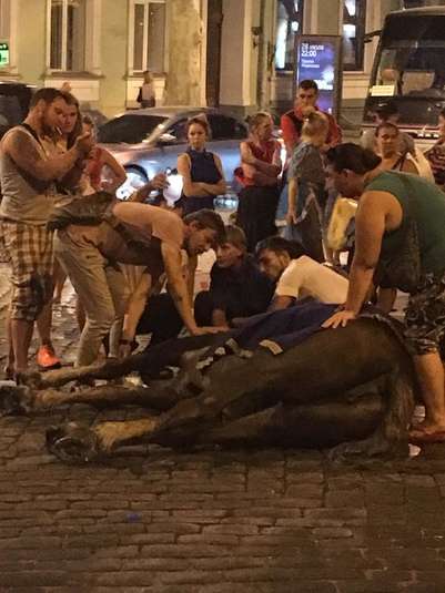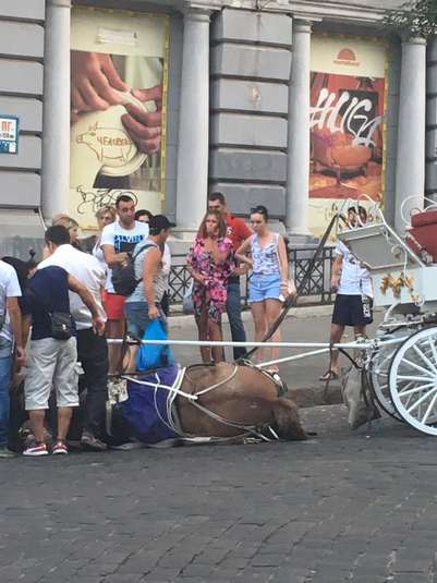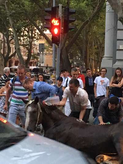 В Одесі ввечері 5 серпня на перехресті вулиць Грецької та Пушкінської звалився кінь, який возив туристичну карету. За словами очевидців, коня нещадно експлуатували, отримуючи від кожного кола по місту 1,5 тисячі гривень, пишуть «Факти».