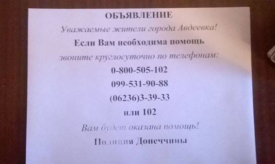 За її даними, правопорядок в Авдіївці збережено, немає фактів мародерств. «Сьогодні до колл-центру 102 від жителів Авдіївки надійшло 16 звернень, 9 з них стосувалися наслідків обстрілів бойовиків. Багато було звернень інформаційного характеру, в тому числі питання, пов’язані з наданням гуманітарної допомоги», - повідомляють в поліції.