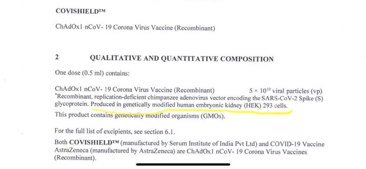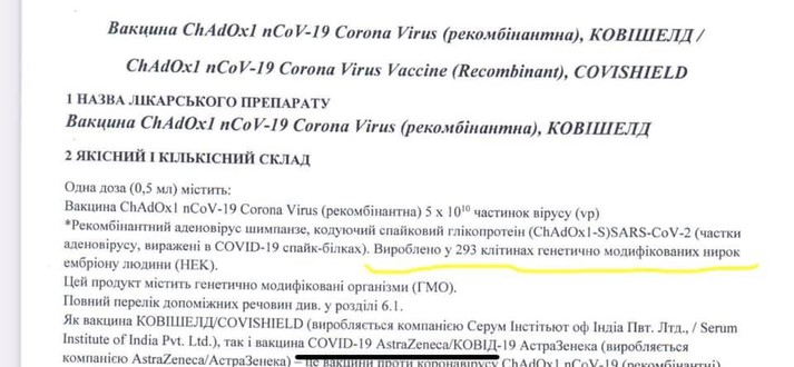 Так, в українській версії інструкції до вакцини Covishield, яка розміщена в державному реєстрі лікарських засобів, йдеться: «Вироблено у 293 клітинах генетично модифікованих нирок ембріону людини». Лікар стверджує, що 293 клітини не мають нічого спільного з клітинною лінією HEK-293, яка справді виділена з людського ембріона вже багато років тому.
