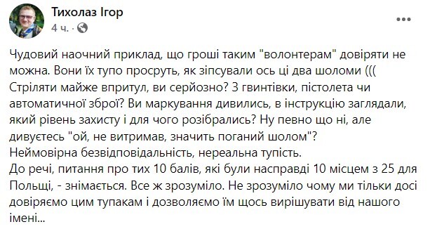 «Нам передали з Америки два шоломи на пробу. Ми перевірили, але, на жаль, ні один, ні інший шолом не витримали експерименту. Тому замовляти таких касок точно не будемо. Волонтерство – це відповідальність, особливо, коли маєш справу з захисною амуніцією. Потрібно чітко розуміти усі ризики і рівень захисту таких речей», – написала Федишин.