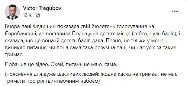 Зірка опублікувала на своїй сторінці відео, де вона разом з колегами «тестує» на міцність американські шоломи, які мали відправлятися на фронт. У ролику Федишин показує, що жодна каска не витримала перевірку прицільним пострілом.