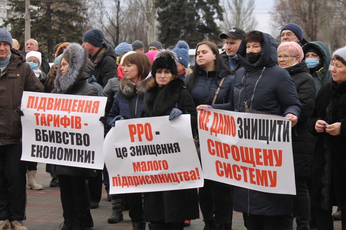 У Запоріжжі близько 150 підприємців вийшли до будівлі ОДА, щоб виступити проти касових апаратів, підвищення тарифів та заявити про необхідність збереження спрощеної системи оподаткування.